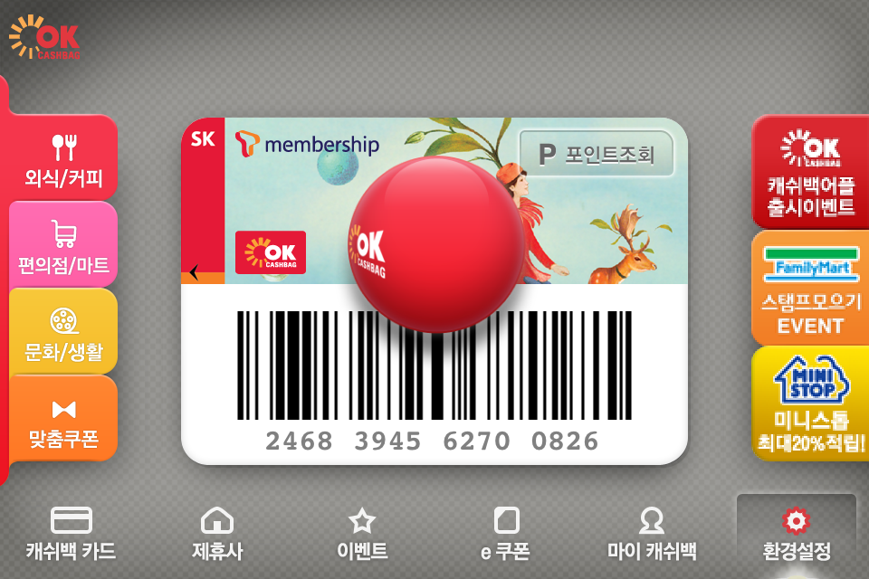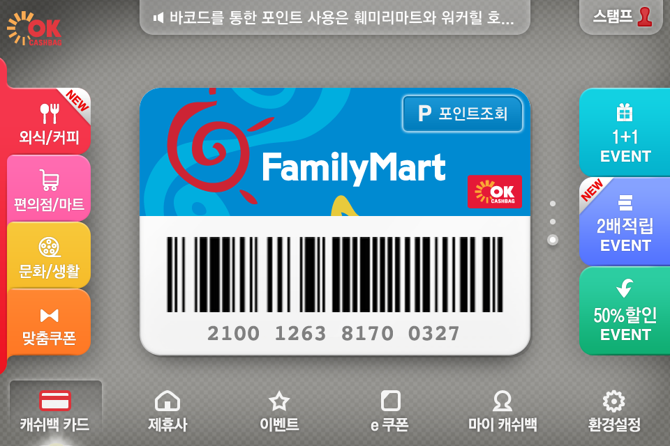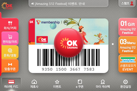 어플을 실행하면 바로 카드와 바코드가 디스플레이됩니다. 실제 오프라인 매장에서 OK캐쉬백 카드를 꺼내서 적립하는 방식과 동일하게 카드 상에 바코드가 표현되어 있어서 적립, 사용이 가능하도록 구현하였습니다. 또한 다중의 카드를 관리할 수 있는 기능도 구현이 되어 있어서 어플에 대한 별다른 학습이 없이도 쉽게 카드를 교체 사용할 수 있습니다. 그리고, 적립 및 사용된 OK캐쉬백 포인트에 대한 정보 역시 쉽고 간단하게 구성되어 있습니다.