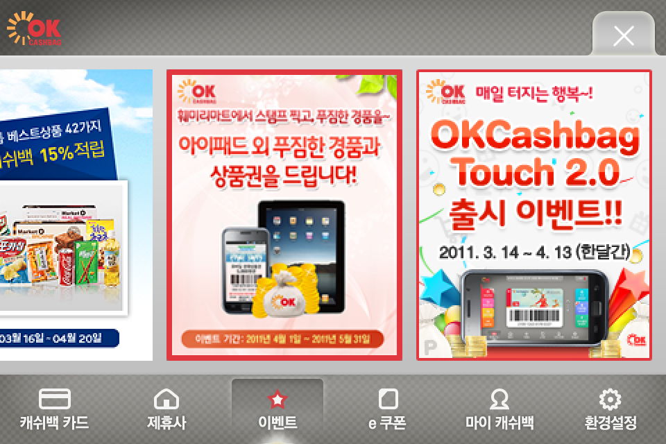 “OK cashbag 2.0 앱. 터치 기반 스마트폰 특성을 잘 살린 UX…”,