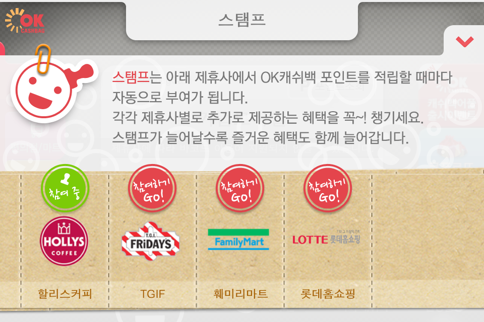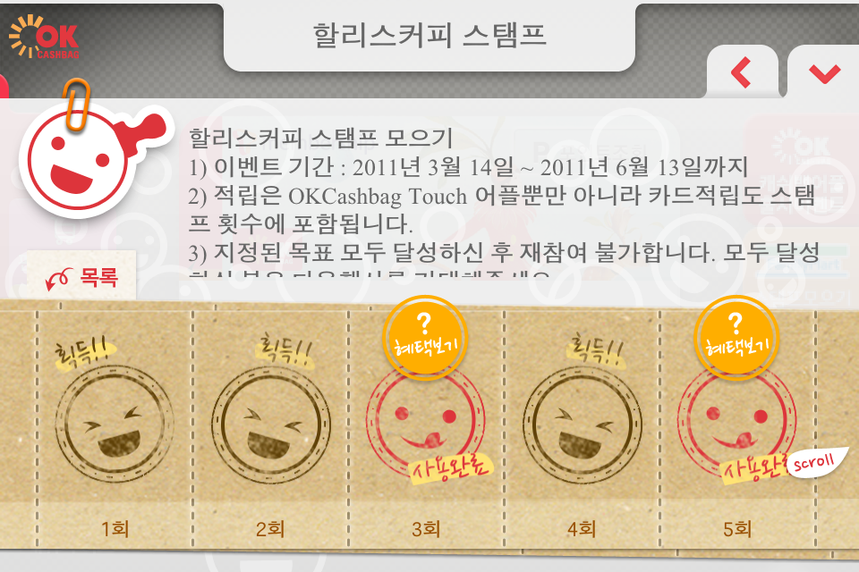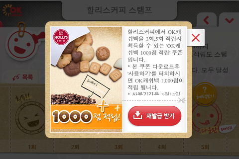 커피빈이나 Holly’s에서 커피 10번 마시면 1잔을 무료로 주는 쿠폰을 다들 가지고 계시죠? OCB2.0 어플에 모바일 적립도장, 즉 스탬프 기능 또한 새롭게 적용되었습니다. OK캐쉬백 제휴사에서 OCB2.0 어플로 적립을 하게 되면 자동으로 스탬프에 ‘획득’ 도장을 받게 됩니다. 중간 중간에 제휴사별로 3회 또는 5회, 10회 마다 추가 혜택이 주어집니다. 고객은 캐쉬백 포인트 적립, 스탬프 추가 혜택과 함께 실제 Holly’s 매장의 경우에는 실물 스탬프까지 1석 3조의 혜택을 얻게 되는 셈입니다. 카드 뿐만 아니라 실물 스템프 카드 또한 디지털로 관리할 수 있게 되었습니다.