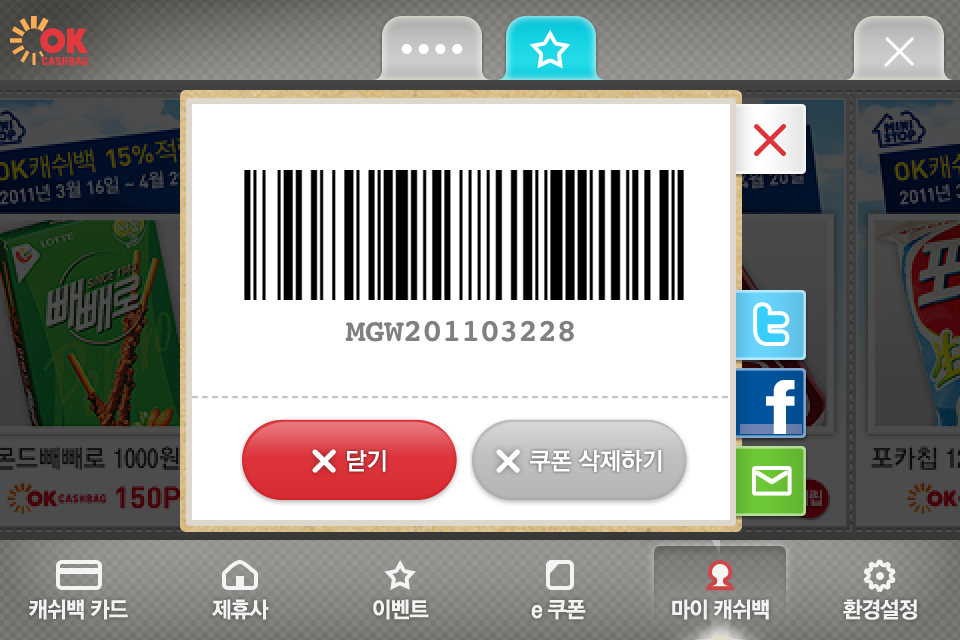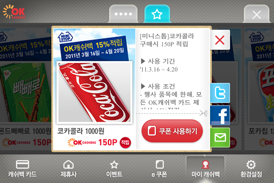 이번 OCB2.0 어플의 가장 주요한 기능 중의 하나인 e쿠폰은 고객에게 직접 리워드가 가능한 프로그램으로 기획되었습니다. 할인, 적립, 무료교환이 가능한 전자쿠폰이어서 역시 각 제휴사의 매장에서 바코드가 부착된 쿠폰을 통해서 고객에게 직접 혜택을 돌려 드릴 수 있게 구현되었습니다. 그리고, 특정 고객을 대상으로 세그멘트(Segment)되어 있는 맞춤쿠폰도 발행이 가능합니다. 즉, 우수고객, VIP 고객, 실적이 없는 고객 등 다양한 고객들에게 각각 맞춤형의 쿠폰이 추가적인 송/수신 비용 없이도 발행이 가능해졌습니다. 고객은 혜택만 받으면 되는 기회가 열린 셈입니다.