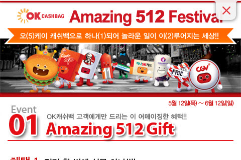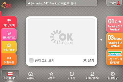 OK캐쉬백으로 적립도 가능하고, 할인도 가능한 제휴사를 고객은 과연 얼마나 기억할까? 평균 주요 제휴사 3개를 기억하는 고객이 대부분이라고 합니다. 실제 1,000원 당 적립되는 적립율, 매장위치 정보, 매장 소개 등의 기본적인 정보도 고객에게는 일부 필요한 요소입니다. 이와 더불어 제휴사가 진행하고 있는 이벤트는 어플에서 또는 매장에서 즉시 참여가 가능한 이벤트들로 진행되고 있습니다.