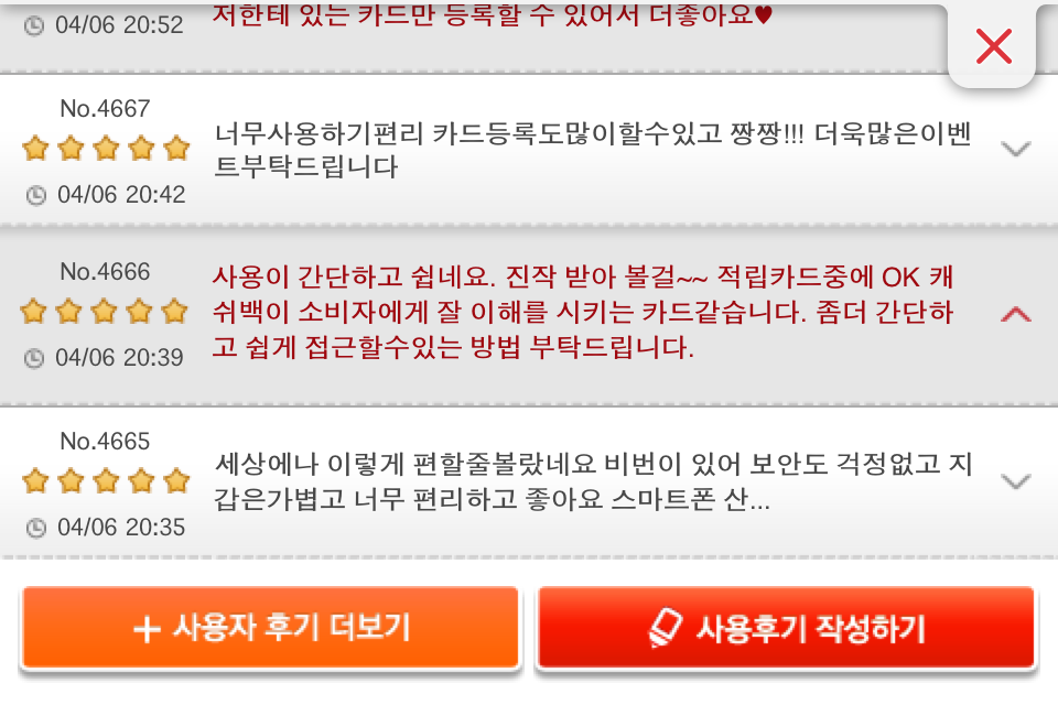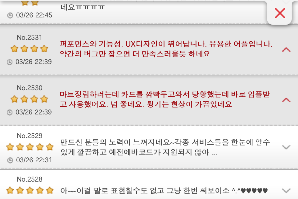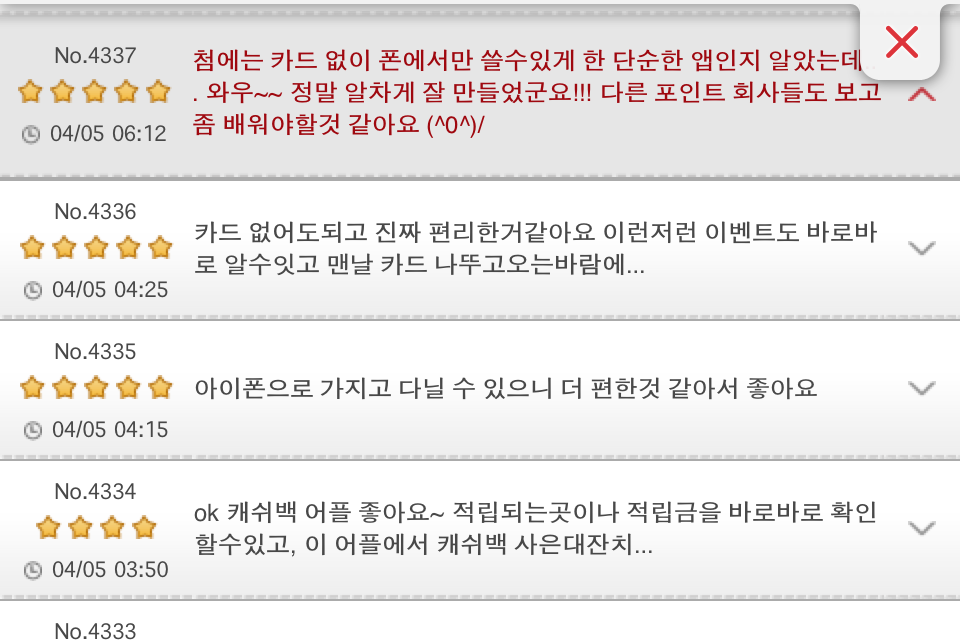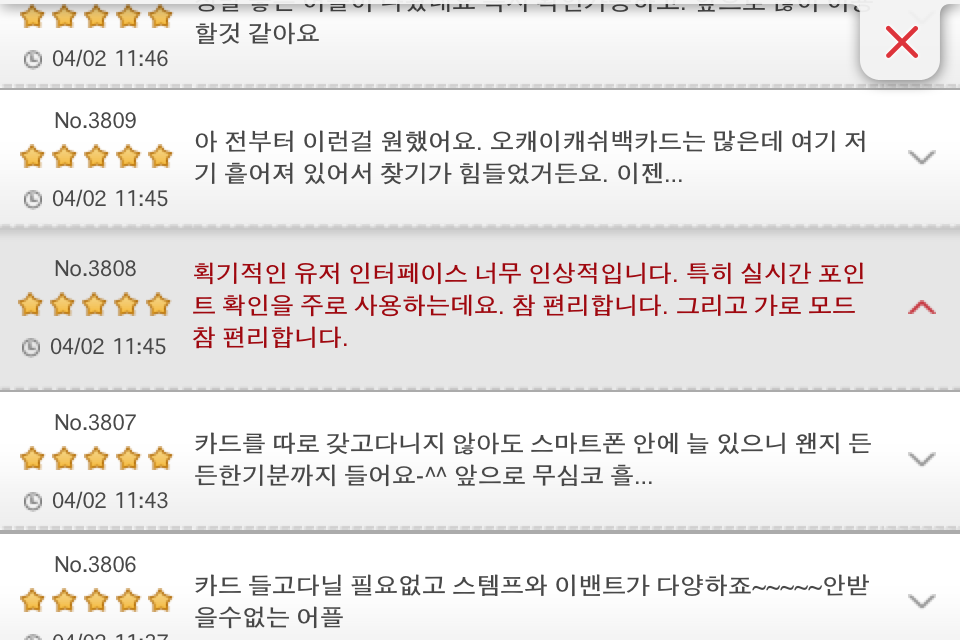 UX는 담당자나 제작사가 이야기하는 부분 보다 오히려 고객의 리뷰를 듣는 게 더 좋을 것 같습니다. OCB2.0 어플에 담긴 리뷰의 내용을 일부 발췌해서 원문 그대로 옮겨봅니다.