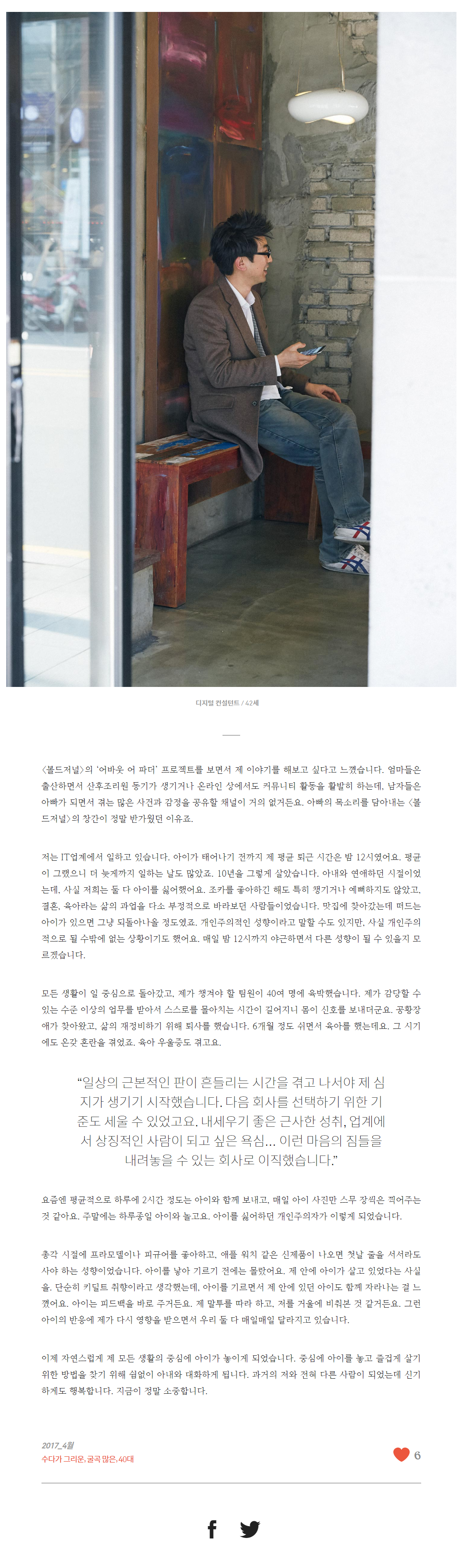 그렇게 몇 달이 흘렀고, 볼드저널에서 ‘어바웃어파더‘라는 섹션의 코너를 진행한다는 것을 알게 되었고, 나는 이 잡지를 만드는 사람들이 궁금해서 ‘당신의 살아온 이야기를 들려주세요.’라는 카피에 혹해서 덜컥 인터뷰 요청을 했다. 2시간 정도 인터뷰를 하고, 역시 시간이 좀 흘러서 어바웃어파더에 인터뷰 내용이 기재되었다.